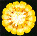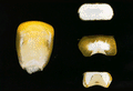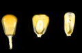 The R3 kernel displays yellow color on the outside, and the inner fluid is now milky white due to accumulating starch. Although initially slow to develop, the embryo is growing rapidly now and is easily seen upon dissection. Most of the R3 kernel has grown out from the surrounding cob materials and the silks at this time are brown and dry or becoming dry.