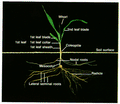 Because the radicle and lateral seminal roots (collectively termed the seminal root system) begin growth directly from the seed, the soil depth at which they initially develop depends upon seed planting depth. Growth of these roots, however, slows soon after VE and is virtually non-existent by the V3 stage. Although the seminal root system continues to function throughout most of the corn plant's life, its most important contribution occurs before the nodal roots become well established .