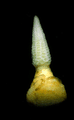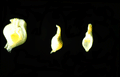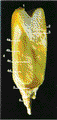 The R1 ovule or kernel is almost completely engulfed in the surrounding cob materials (technically termed the glumes, lemmas and paleas) and is white in color on the outside. The inner material of the R1 kernel is clear and has very little fluid present. The embryo or germ is not yet visible when dissected with a razor blade (see fig. 37 ). The shank and husks attain full size between the R1 and R2 stages.