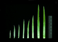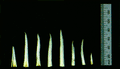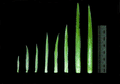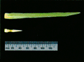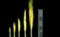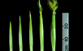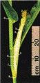 Each leaf stage is defined according to the uppermost leaf whose leaf collar is visible. The first part of the collar that is visible is the back which appears as a discolored line between the leaf blade and leaf sheath, figs. 1 and 3 . The characteristically oval-shaped first leaf is a reference point for counting upward to the top visible leaf collar.
