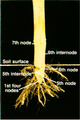 The soil depth of the growing point at VE also marks the depth at which initial nodal root growth will begin. This depth (2.5-3.8 cm) is relatively constant over different planting depths due to mesocotyl elongation, see fig. 6 .