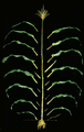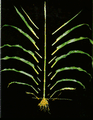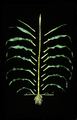 Many ear shoots are now easily visible upon dissection of a V9 plant, fig. 13 . An ear shoot (potential ear) will develop from every above-ground node, except the last six to eight nodes below the tassel. Initially, each ear shoot develops faster than the ear shoots originating above it on the stalk. However, growth of most lower stalk ear shoots eventually slows. and only the upper one or two ear shoots ever develop into a harvestable ear. Hybrids that produce more than one harvestable ear on the main stem are termed prolific. The tendency for a plant to display prolificness increases with low plant densities.