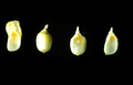 Continued starch accumulation in the endosperm has now caused the milky inner fluid to thicken to a pasty consistency. Usually four embryonic leaves have formed by this time and the R4 embryo has greatly increased in size from the R3 stage. The shelled cob is a light red to pink color due to beginning color changes of the surrounding materials (lemmas and paleas).