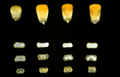Figure 41 displays kernels from ears that were (from left to right) 7, 10, 12 (R2), and 1 8(R3) days after silking. Each row then corresponds to the same manner of kernel display as in fig. 40.