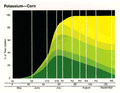 The seasonal pattern of nutrient accumulation in the plant is similar to that of dry matter accumulation (see fig. 54 ). However, nutrient uptake begins even before the plant emerges from the soil. The amounts of nutrients taken up early in the growing season are small, but the nutrient concentrations in the soil surrounding the roots of the small plant at that stage often must be high.