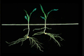 Under adequate field conditions, the planted seed absorbs water and begins growth. The radicle is first to begin elongation, fig. 5 , from the swollen kernel, followed by the coleoptile with the enclosed plumule (embryonic plant), and then the three to four lateral seminal roots. VE (emergence) is finally attained by rapid mesocotyl elongation which pushes the growing coleoptile to the soil surface, white line in fig. 5. Under warm, moist conditions, plant emergence will occur within 4 to 5 days after planting, but under cool or dry conditions, 2 weeks or longer may be required.