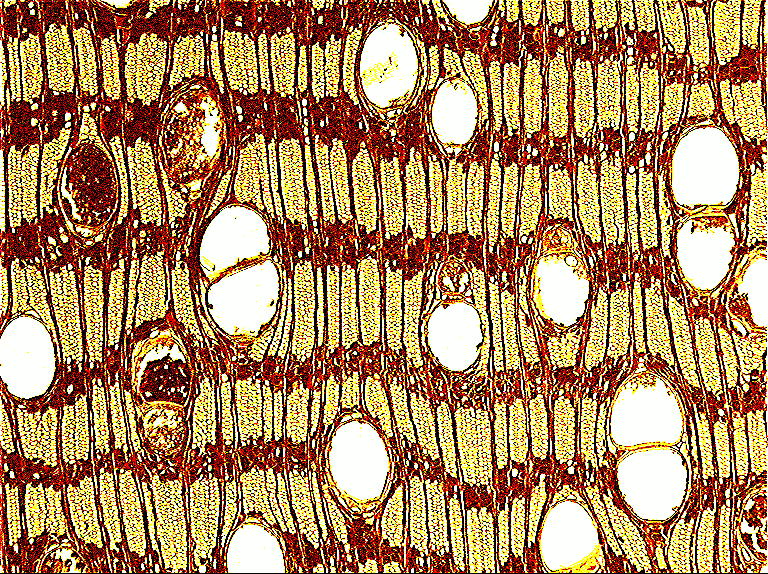 Holzstrahlen. Anzahl der Holzstrahlen je mm: 811, Holzstrahlen mehrreihig, auch wenn nur vereinzelt, Breite: 123 Zellen (selten einreihig). Holzstrahlen aus einem Zelltyp aufgebaut. Zellen liegend.